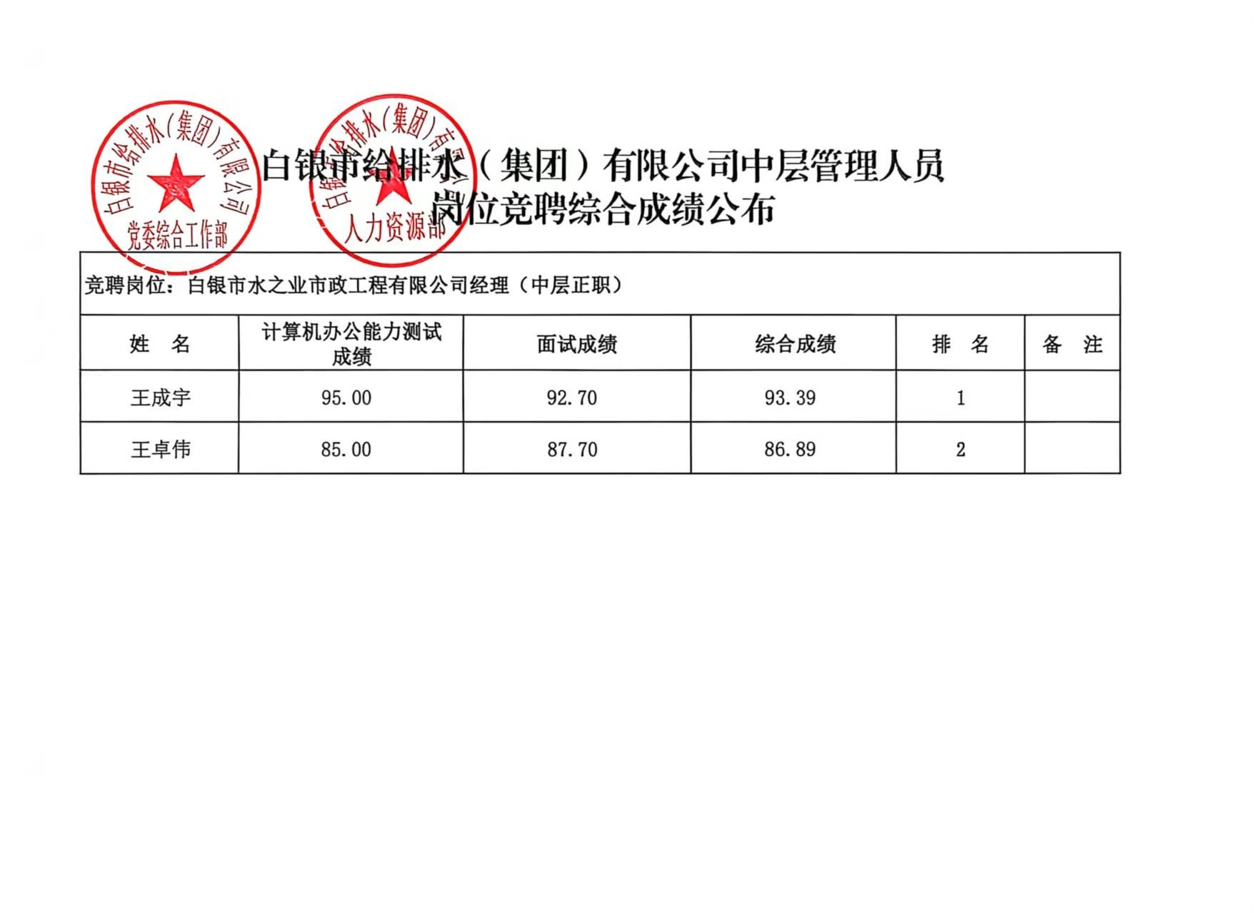 白銀市給排水(集團)有限公司中層管理人員崗位競聘綜合成績公布